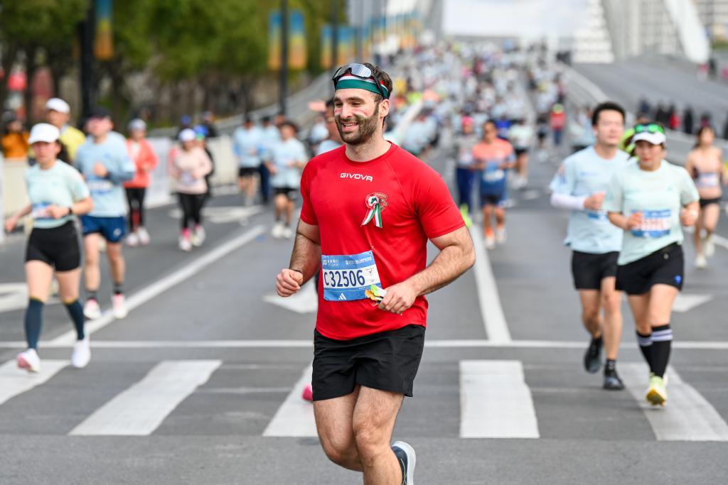 2026年3月15日,上海,一名外国选手张开双手冲过终点。澎湃新闻记者 朱伟辉 图