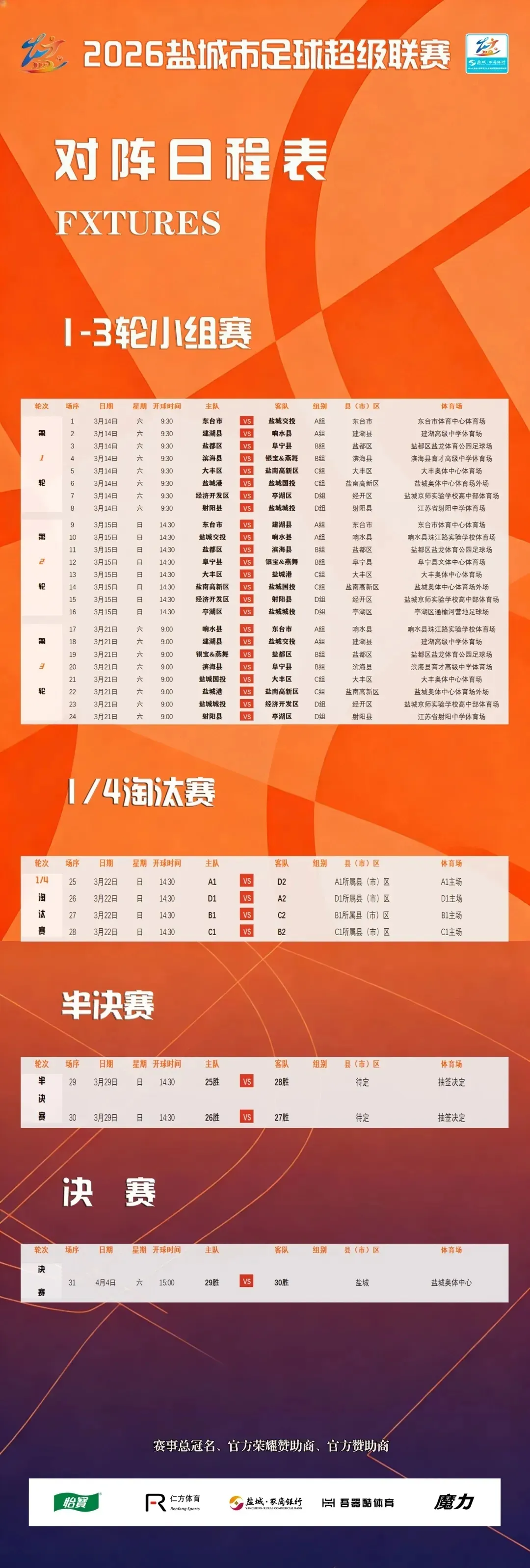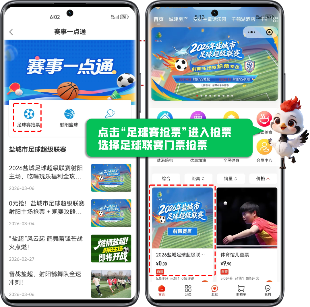 3月14日2026年盐城市足球超级联赛已经火热开赛啦~小组赛第三轮3月21日射阳队主场对阵亭湖队即将开票本次抢票分为四轮次3月16日-3月19日每天上午10:00在“我的盐城”APP开抢(2)登录“我的盐城”APP ,进入射阳板块→消费之窗→赛事活动(如图所示);(3)点击足球赛抢票进入抢票页面,选择足球联赛射阳主场门票链接;(4)点击购买,支付结算完成购票...